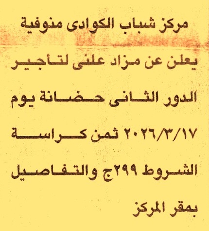 HOT Information مزايدة عملية لعملية تأجير الدور الثاني حضانة عن جريدة الجمهورية Post navigation مستشفى جامعة قناة السويس التخصصي بالإسماعيلية محافظة قنا
