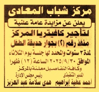 HOT Information مزايدة علنية عامة لعملية تأجير كافتيريا المركز منفذ رقم 2 بجوار حديقة الطفل لمدة 3 سنوات عن جريدة الأخبار Post navigation الهيئة المصرية العامة للمعارض والمؤتمرات جهاز تنمية مدينة سوهاج الجديدة
