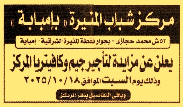 HOT information مزايدة عامة لعملية تأجير كافتيريا المركز عن جريدة الجمهورية Post navigation الوحدة المحلية لمركز ومدينة الفيوم الهيئة العامة للخدمات الحكومية