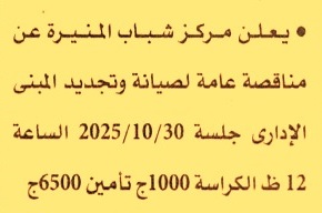 HOT Information مناقصة عامة لعملية صيانة وتجديد المبنى الإداري عن جريدة الأهرام Post navigation حي أول الإسماعيلية نادي المدينة المنورة