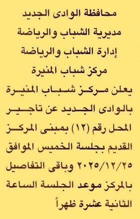 HOT Information مزايدة عامة لعملية تأجير المحل رقم 12 بمبنى المركز القديم عن جريدة الجمهورية Post navigation مركز شباب الشواشنة نادي الإبراهيمية الرياضي