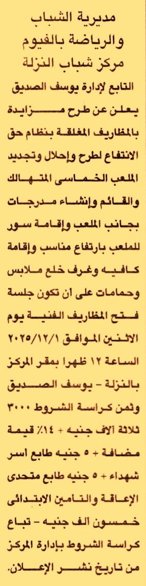 HOT Information مزايدة عامة لعملية حق الإنتفاع لإحلال وتجديد الملعب الخماسي المتهالك والقائم وإنشاء مدرجات بجانب الملعب وإقامة سور للملعب بارتفاع مناسب وإقامة كافيه وغرف خلع ملابس وحمامات عن جريدة الجمهورية Post navigation مركز شباب ميت الخولي عبد الله بدمياط جمعية فتيان الكشافة