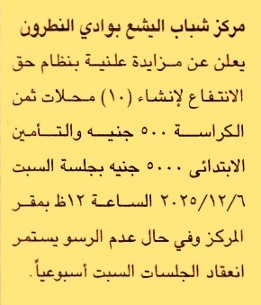 HOT Information مزايدة علنية لعملية إنشاء عدد 10 محلات بنظام حق الإنتفاع (تعاد الجلسة أسبوعيا حتى إتمام الرسو) عن جريدة الجمهورية Post navigation الهيئة القومية لسكك حديد مصر الإدارة العامة لصرف شمال المنيا