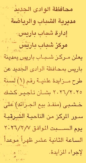 HOT Information مزايدة علنية رقم 1/2025/2026 لعملية تأجير كشك خشبي “منفذ بيع الجرائد” على سور المركز من الناحية الشرقية عن جريدة الجمهورية Post navigation مركز شباب حوش عيسى الهيئة العامة للأبنية التعليمية
