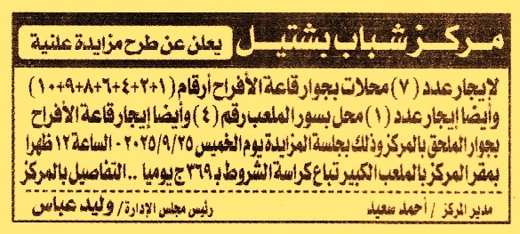 HOT Information مزايدة علنية لعملية تأجير عدد 7 محلات بجوار قاعة الأفراح وعدد 1 محل بسور الملعب رقم 4 وقاعة الأفراح بجوار الملحق بالمركز عن جريدة الجمهورية Post navigation محافظة قنا مركز التنمية الشبابية بالمنشية الجديد بشبرا الخيمة