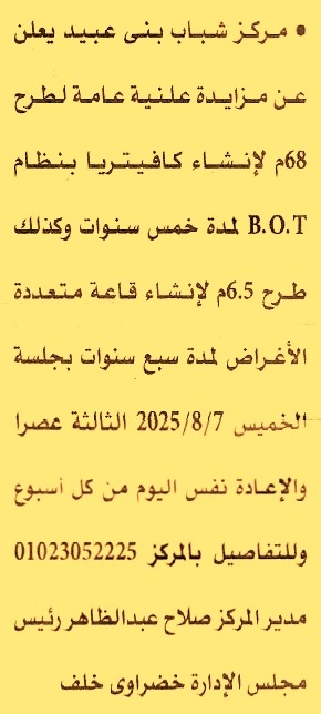 HOT Information مزايدة علنية عامة لعملية طرح 68م لإنشاء كافتيريا بنظام حق الإنتفاع لمدة 5 سنوات وطرح مساحة 6.5م لإنشاء قاعة متعددة الأغراض بنظام حق الإنتفاع لمدة 7 سنوات (تعاد الجلسة أسبوعيا حتى إتمام الرسو) عن جريدة الأهرام Post navigation شركة مياه الشرب والصرف الصحي بمطروح جمعية التضامن الإسلامي