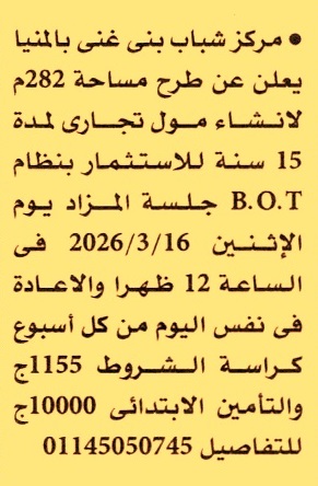 HOT Information مزايدة عامة لعملية طرح مساحة 282م لإنشاء مول تجاري بنظام حق الإنتفاع لمدة 15 سنة (تعاد الجلسة أسبوعيا حتى إتمام الرسو) عن جريدة الأهرام Post navigation شركة سيناء للمنجنيز بنك مصر
