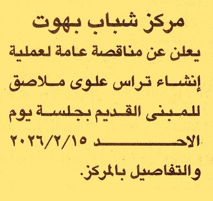 HOT information مناقصة عامة لعملية إنشاء تراس علوي ملاصق للمبنى القديم عن جريدة الجمهورية Post navigation نادي دكرنس الرياضي بالدقهلية محافظة البحيرة مديرية الشباب والرياضة