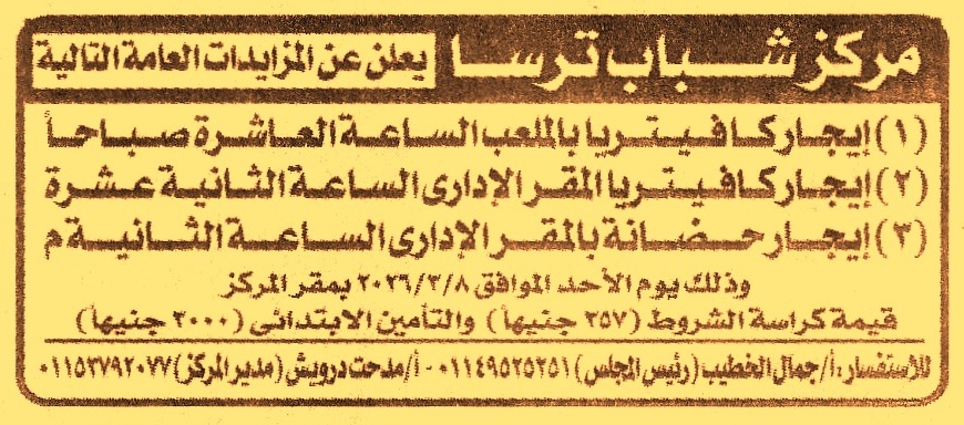 HOT information مزايدة عامة لعملية تأجير الأتي (1) كافتيريا بالملعب (2) كافتيريا المقر الإداري (3) حضانة بالمقر الإداري عن جريدة الجمهورية Post navigation شركة أبو زعبل للصناعات الهندسية جهاز تنمية مدينة أخميم الجديدة