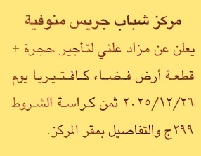HOT Information مزايدة علنية لعملية تأجير حجرة وقطعة أرض فضاء كافتيريا عن جريدة الجمهورية Post navigation رئاسة حي ثاني المحلة الكبرى جامعة اسيوط