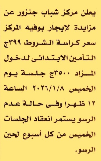 HOT Information مزايدة عامة لعملية تأجير بوفيه المركز (تعاد الجلسة أسبوعيا حتى إتمام الرسو) عن جريدة الأخبار Post navigation شركة مصر لصناعة الكيماويات الإدارة العامة لصرف غرب كفر الشيخ