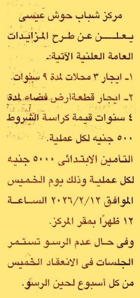 HOT Information مزايدة علنية عامة لعملية تأجير الأتي (1) تأجير 3 محلات لمدة 9 سنوات (2) تأجير قطعة أرض فضاء لمدة 4 سنوات (تعاد الجلسة أسبوعيا حتى إتمام الرسو) عن جريدة الجمهورية Post navigation مركز شباب سمادون بالمنوفية مركز شباب باريس