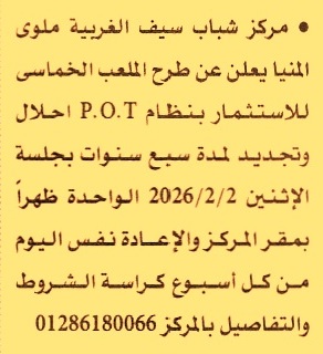 HOT Information مزايدة عامة لعملية إحلال وتجديد الملعب الخماسي بنظام حق الإنتفاع لمدة 7 سنوات (تعاد الجلسة أسبوعيا حتى إتمام الرسو) عن جريدة الأهرام Post navigation مركز شباب نزلة البرشا مركز شباب دروة