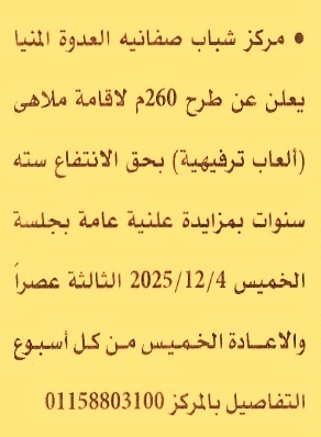 HOT Information مناقصة عامة لعملية طرح 260م لإقامة ملاهي “ألعاب ترفيهية” بنظام حق الإنتفاع لمدة 6 سنوات (تعاد الجلسة أسبوعيا حتى إتمام الرسو) عن جريدة الأهرام Post navigation مركز شباب كوم شريك بكوم حمادة رئاسة مركز ومدينة بلبيس