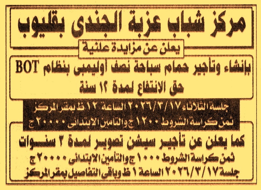 HOT Information مزايدة علنية لعملية إنشاء وتأجير حمام سباحة نصف أوليمبي بنظام حق الإنتفاع لمدة 12 سنة عن جريدة الجمهورية Post navigation الجمعية المشتركة للبناء والإسكان لمشروع لؤلؤة أكتوبر الوحدة المحلية لمركز ومدينة أخميم
