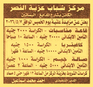 HOT information مزايدة علنية لعملية تأجير الأتي (1) قاعة مناسبات (2) كافتيريا عن جريدة الأخبار Post navigation نادي الدرب الأحمر بنك مصر