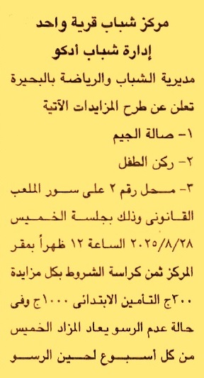 HOT Information مناقصة عامة لعملية تأجير الأتي (1) ركن الطفل (2) محل رقم 2 على سور الملعب القانوني (تعاد الجلسة أسبوعيا حتى إتمام الرسو) عن جريدة الجمهورية Post navigation شركة البتروكيماويات المصرية مركز شباب أتريس