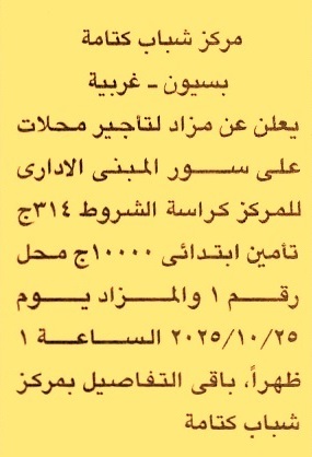 HOT information مزايدة عامة لعملية تأجير محلات على سور المبنى الإداري للمركز عن جريدة الجمهورية Post navigation مركز شباب السيدة زينب شركة مياه الشرب والصرف الصحي بمحافظات القناة