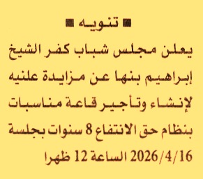 HOT information مركز شباب كفر الشيخ إبراهيم ببنها يعلن المركز عن تعديل بخصوص المزايدة العلنية لعملية تأجير قاعة أفراح مفتوحة لتصبح إنشاء وتأجير قاعة مناسبات بنظام حق الانتفاع لمدة 8 سنوات والمحدد لها جلسة يوم 16/4/2026 عن جريدة الأهرام Post navigation Egyptian Holding Company For Airports and Air navigation الشركة الوطنية لخدمات الملاحة الجوية