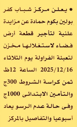 HOT Information مزايدة علنية لعملية تأجير قطعة أرض فضاء لاستغلالها مخزن لتعبئة الفراولة (تعاد الجلسة أسبوعيا حتى إتمام الرسو) عن جريدة الأهرام Post navigation وزارة المالية جهاز تنمية مدينة العاشر من رمضان