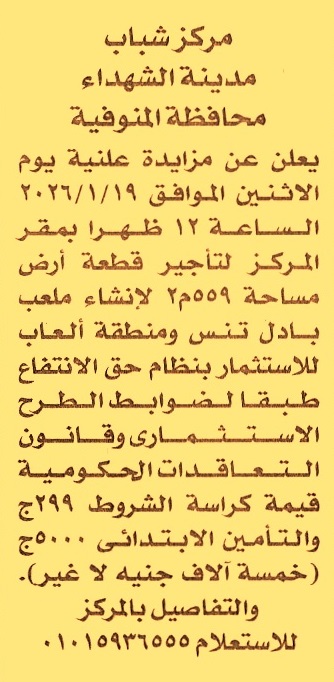 HOT information مزايدة علنية لعملية تأجير قطعة أرض بمساحة 559م2 لإنشاء ملعب بادل تنس ومنطقة ألعاب بنظام حق الانتفاع عن جريدة الأخبار Post navigation الشركة المصرية للأملاح والمعادن بالفيوم شركة المركز الطبي المصري للأدوية