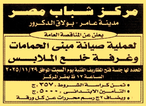 HOT Information مناقصة عامة لعملية صيانة مبنى الحمامات وغرفة خلع الملابس عن جريدة الجمهورية Post navigation مديرية الشباب والرياضة بالفيوم جامعة شرق بورسعيد التكنولوجية