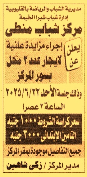 HOT Information مزايدة علنية لعملية تأجير عدد 2 محل بسور المركز عن جريدة الجمهورية Post navigation نقابة المهن الزراعية بالفيوم مكتب الخبراء المثمنين إبراهيم عارف إبراهيم