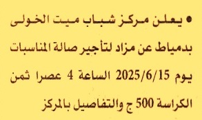 HOT Information مزايدة عامة لعملية تأجير صالة المناسبات عن جريدة الأهرام Post navigation الادارة المركزية لشئون محطات البحوث والتجارب الزراعية محافظة مطروح