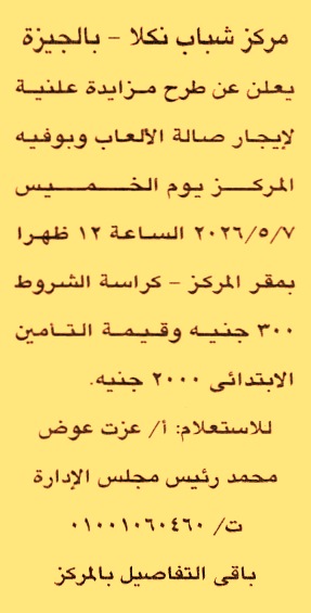HOT information مزايدة علنية لعملية تأجير صالة الألعاب وبوفيه المركز عن جريدة الجمهورية Post navigation شركة بوتاجاسكو لتوصيل وتوزيع الغاز هيئة النقل العام بالقاهرة