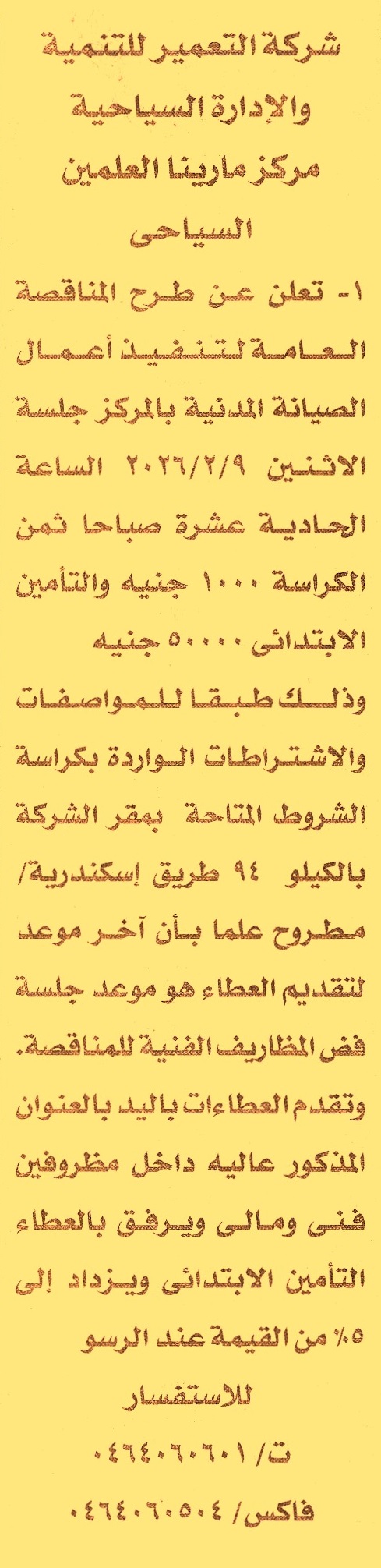 HOT information مناقصة عامة لعملية تنفيذ أعمال الصيانة المدنية بالمركز عن جريدة الأخبار Post navigation الإدارة العامة للموارد المائية والري بالغربية شركة مطاحن ومخابز شمال القاهرة