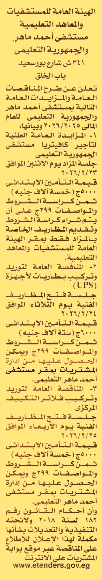 HOT Information مزايدة علنية عامة لعملية تأجير كافتيريا مستشفى الجمهورية التعليمي عن جريدة الأخبار Post navigation نادي العروبة الرياضي بكفر عنان شركة الغازات البترولية