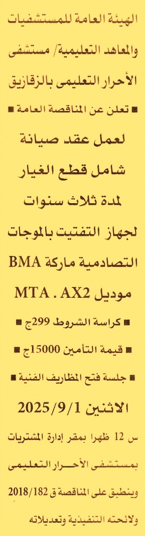 HOT Information ممارسة عامة لعملية عمل عقد صيانة شامل قطع الغيار لمدة 3 سنوات لجهاز التفتيت بالموجات التصادمية ماركة BMA موديل MTA . AX2 عن جريدة الأهرام Post navigation مكتب النائب العام مكتب النائب العام