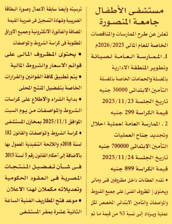 HOT information ممارسة عامة لعملية صيانة وتطوير المنطقة الإدارية بالمغسلة والحمامات الخاصة بالمغسلة (يرفق مع المستندات سابقة أعمال وتباع الكراسة من يوم 1/11/2025) عن جريدة الأهرام Post navigation الهيئة العامة للتنمية الصناعية الشركة القابضة لمصر للطيران