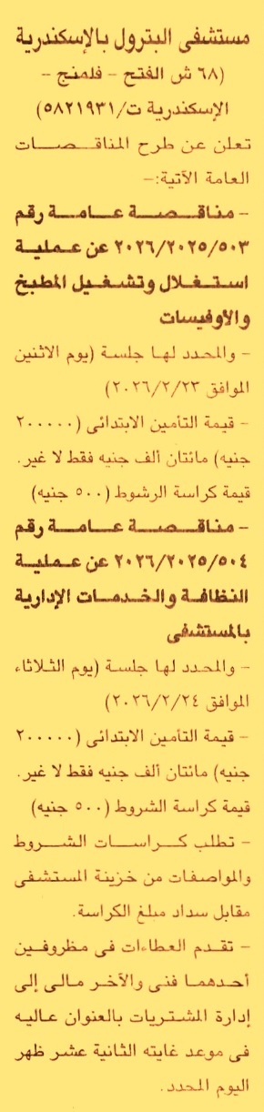 HOT Information مناقصة عامة رقم 503/2025/2026 لعملية استغلال وتشغيل المطبخ والأوفيسات عن جريدة الجمهورية Post navigation محافظة الإسكندرية النادي الأهلي للرياضة البدنية