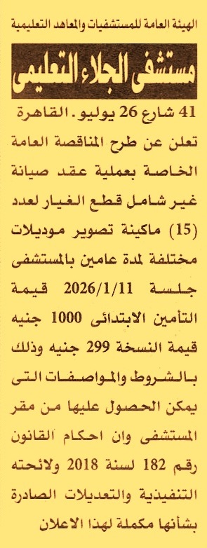 HOT Information مناقصة عامة لعملية إبرام عقد صيانة غير شامل قطع الغيار لعدد 15 ماكينة تصوير موديلات مختلفة لمدة عامين بالمستشفى عن جريدة الأهرام Post navigation الهيئة العامة للمستشفيات والمعاهد التعليمية الإدارة العامة لمشروعات صرف مصر العليا بقنا