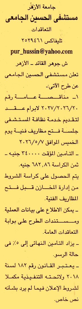 HOT Information مناقصة عامة رقم 20/2025/2026 لعملية تقديم خدمة نظافة المستشفى عن جريدة الجمهورية Post navigation معهد بحوث البترول شركة قنا لصناعة الورق