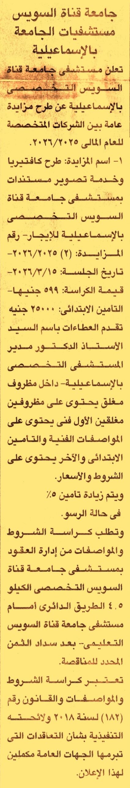 HOT Information مزايدة عامة رقم 2/2025/2026 لعملية تأجير كافتيريا وخدمة تصوير مستندات بالمستشفى عن جريدة الجمهورية Post navigation وزارة الشباب والرياضة مركز شباب الكوادي بالمنوفية