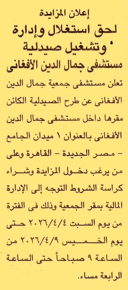 HOT Information مزايدة عامة لعملية حق استغلال وإدارة وتشغيل صيدلية المستشفى (تباع الكراسة من يوم 4/4/2026 حتى يوم 9/4/2026 من الساعة 9 ص حتى 4 م) عن جريدة الجمهورية Post navigation وزارة الشباب والرياضة مركز شباب كفر بطا ببنها