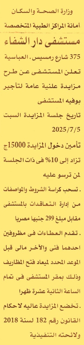 HOT Information مزايدة علنية عامة لعملية تأجير بوفيه المستشفى عن جريدة الأهرام Post navigation مدارس ليسيه الهرم جمعية علي بن أبي طالب الخيرية
