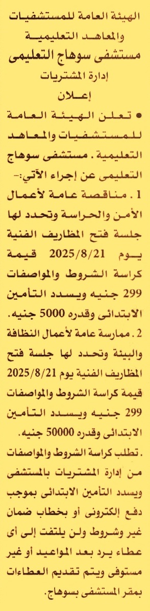 HOT Information مناقصة عامة لعملية تنفيذ أعمال الأمن والحراسة عن جريدة الأهرام Post navigation الهيئة العامة للتنمية الصناعية مدارس النصر بمصر الجديدة