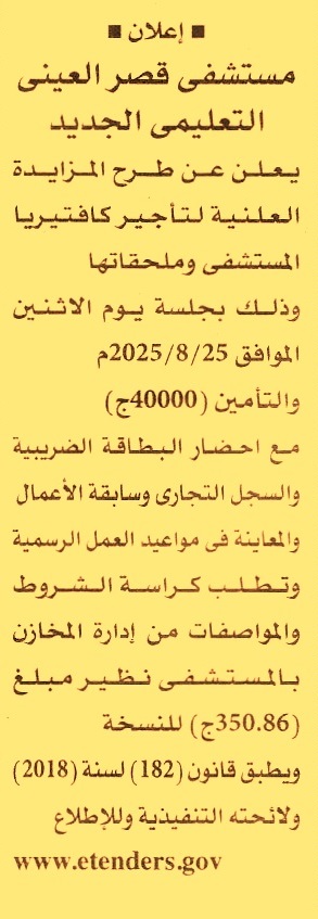 HOT Information مزايدة علنية لعملية تأجير كافتيريا المستشفى وملحقاتها (يرفق مع المستندات سابقة أعمال) عن جريدة الأهرام Post navigation شركة طنطا للزيوت والصابون والمياه الطبيعية الوحدة المحلية لمركز ومدينة ابشواي