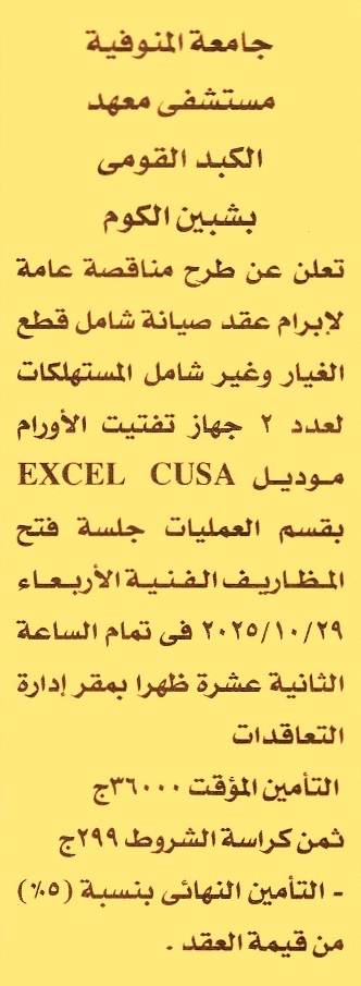 HOT information مناقصة عامة لعملية إبرام عقد صيانة شامل قطع الغيار وغير شامل المستهلكات لعدد 2 جهاز تفتيت الأورام موديل EXCEL CUSA بقسم العمليات عن جريدة الأخبار Post navigation كلية العلوم بجامعة القاهرة الهيئة القومية لسكك حديد مصر