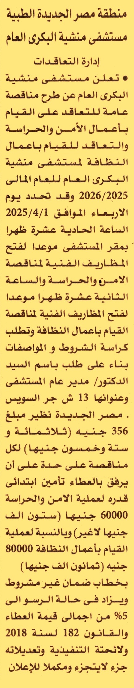 HOT Information مناقصة عامة لعملية تنفيذ الأعمال الأتي (1) الأمن والحراسة (2) أعمال النظافة للمستشفى عن جريدة الأهرام Post navigation الهيئة العامة للتنمية الصناعية محافظة كفر الشيخ