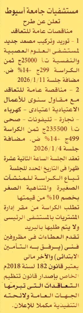 HOT Information مناقصة عامة لعملية توريد وتركيب مصعد جديد لمستشفى العلوم العصبية والنفسية (تباع الكراسة بخصم 10% للمنشأت الصغيرة والمتناهية الصغر) عن جريدة الأهرام Post navigation وزارة التعليم العالي هيئة الإغاثة الكاثوليكية