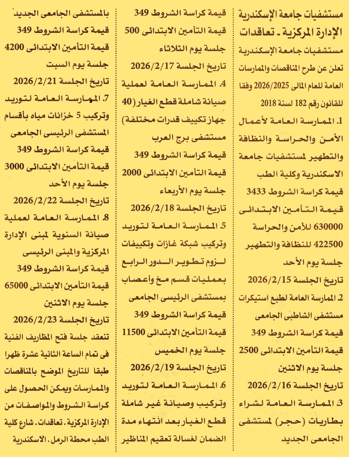 HOT Information ممارسة عامة لعملية تنفيذ أعمال الأمن والحراسة والنظافة والتطهير لمستشفيات جامعة الإسكندرية وكلية الطب عن جريدة الأهرام Post navigation مركز شباب ميت العطار مستشفيات جامعة الاسكندرية