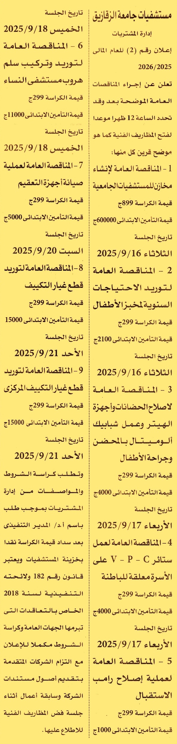 HOT Information مناقصة عامة لعملية إنشاء مخازن للمستشفيات الجامعية (يرفق مع المستندات سابقة أعمال وأصول المستندات للإطلاع عليها) عن جريدة الأهرام Post navigation الهيئة القومية لسكك حديد مصر المشروع الخدمي للتغذية المدرسية