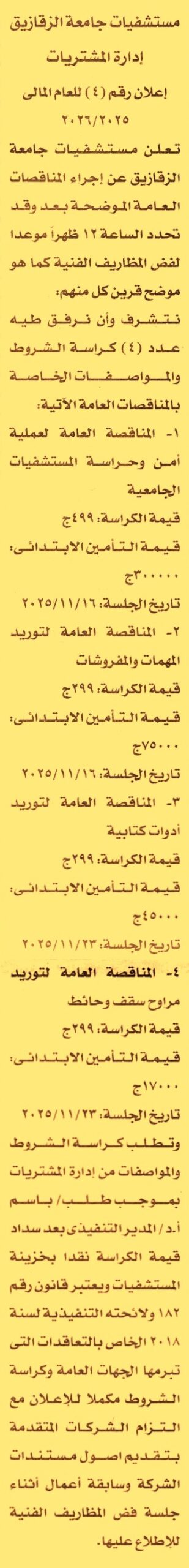 HOT Information مناقصة عامة لعملية تنفيذ أعمال أمن وحراسة المستشفيات الجامعية (يرفق مع المستندات سابقة أعمال وأصول المستندات للإطلاع عليها) عن جريدة الأخبار Post navigation جهاز تنمية مدينة حدائق أكتوبر جامعة طنطا