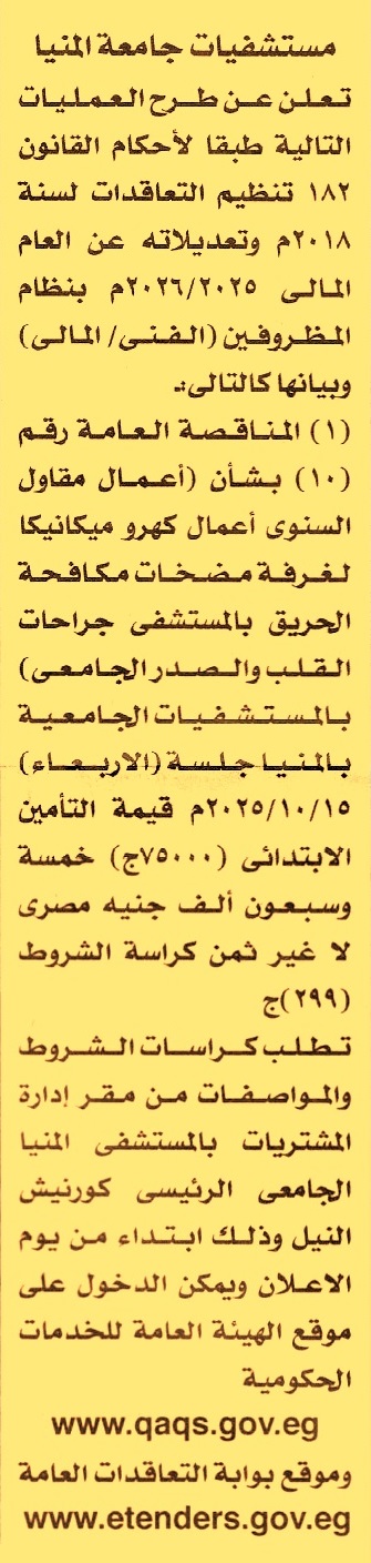 HOT information مناقصة عامة رقم 10/2025/2026 لعملية تنفيذ أعمال المقاول السنوي لأعمال كهروميكانيكا لغرفة مضخات مكافحة الحريق بمستشفى جراحات القلب والصدر الجامعي عن جريدة الأخبار Post navigation المكتب الكويتي للمشروعات الخيرية بالقاهرة جامعة المنوفية