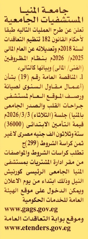 HOT information مناقصة عامة رقم 19/2025/2026 لعملية تنفيذ أعمال مقاول السنوي لصيانة ورصف الموقع العام لمستشفى جراحات القلب والصدر الجامعي بالمنيا عن جريدة الأهرام Post navigation محافظة سوهاج مديرية الطرق والنقل محافظة المنيا مديرية الطب البيطري