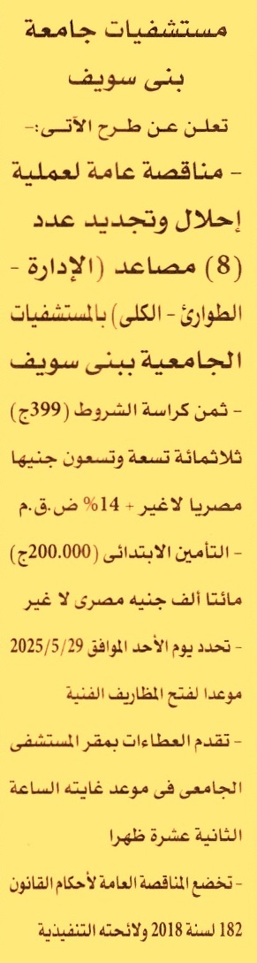 HOT Information مناقصة عامة لعملية إحلال وتجديد عدد 8 مصاعد “الإدارة – الطوارئ – الكلى” بالمستشفيات الجامعية ببني سويف عن جريدة الأهرام Post navigation شركة مياه الشرب والصرف الصحي بسوهاج مكتب النائب العام